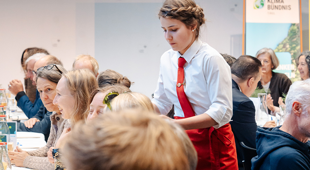 Das dreigängige, vegetarisch-vegane Menü wurde von Schülerinnen der Landwirtschaftlichen Lehranstalt Rotholz, Dietmar Fröhlich (Alpine Elements & United Against Waste) sowie Theresa Fessler (Initiative DoppelPlus) zubereitet. Der volle Saal freute sich über abwechslungsreiche und genussvolle Gerichte – von der Kürbis-Topinambur-suppe über eine deftige Tirol-Bowl bis zu Apfel-Haferschnitten.